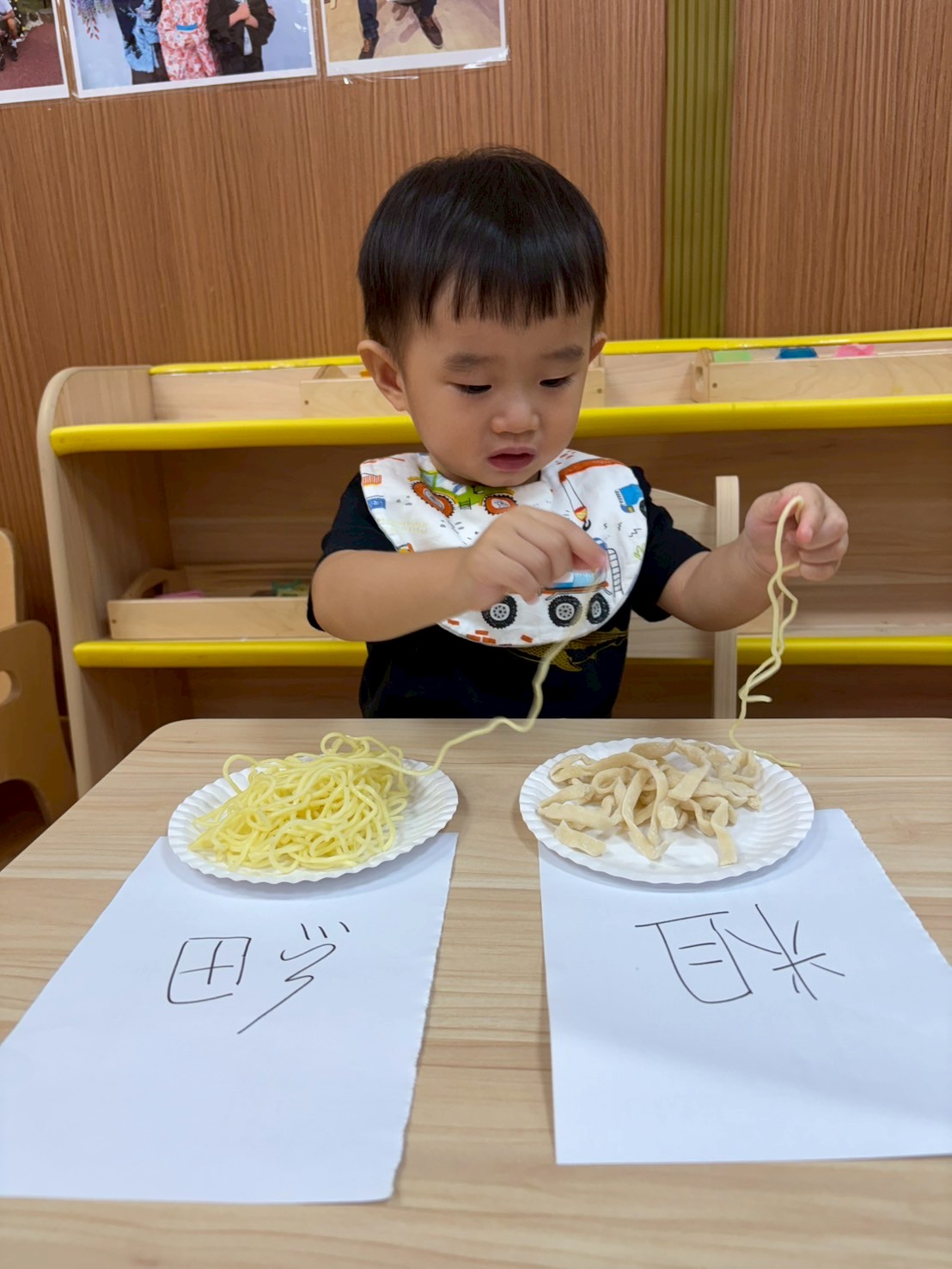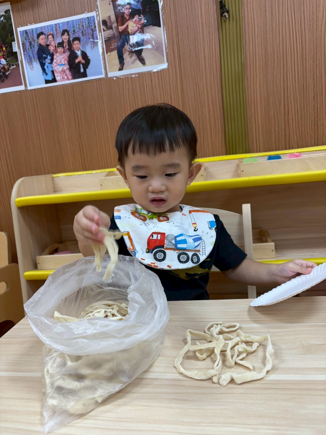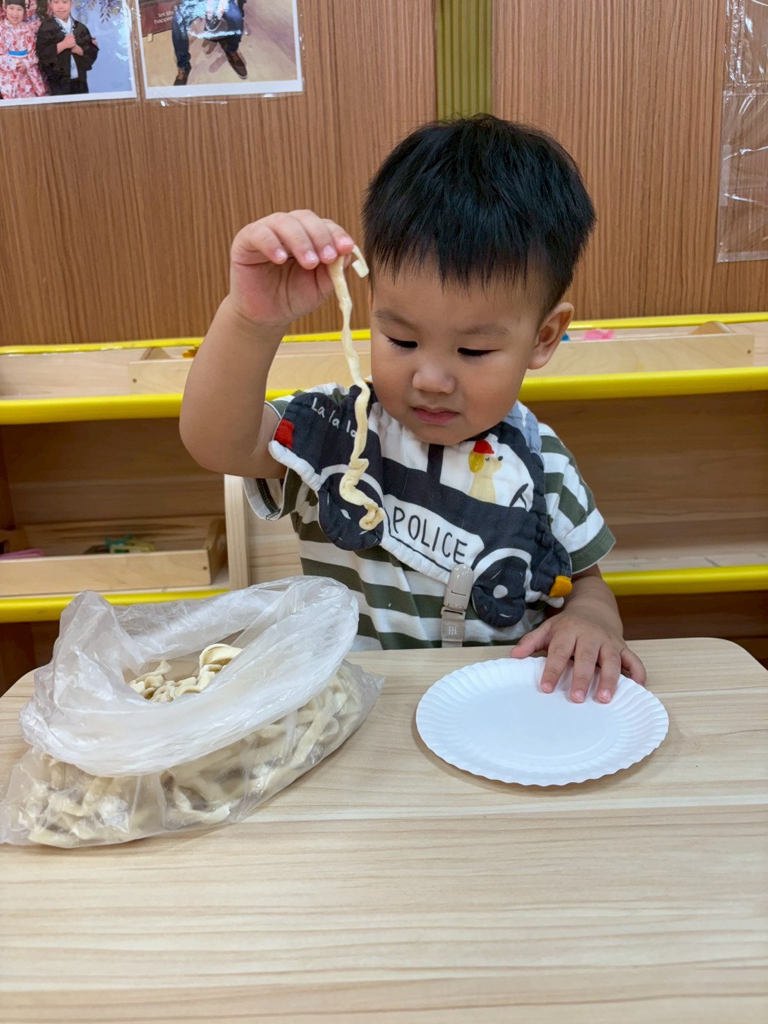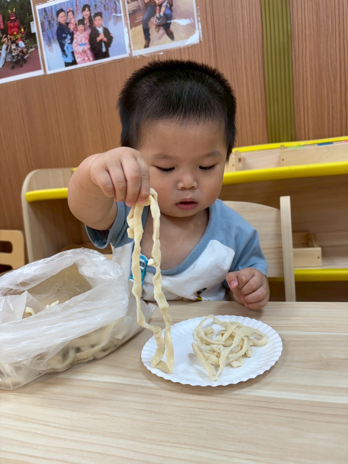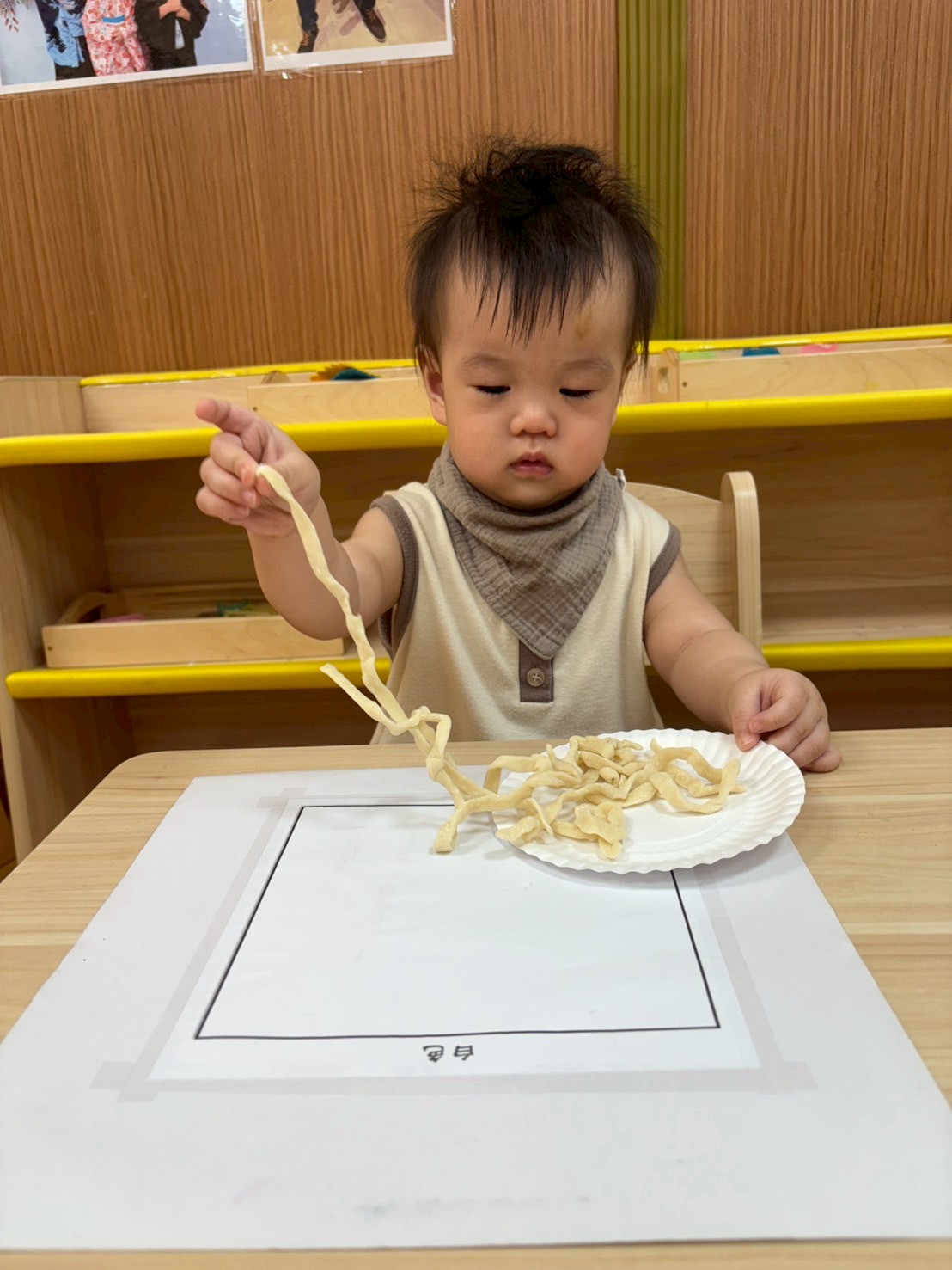 這週課程進行『好吃的麵條』,寶貝們興奮地動手玩著麵條,有的拉一拉、有的搓一搓,比較大的寶貝還會拿著麵條比較長短,在課程中體驗到不同的感官樂趣呢!