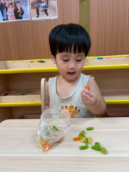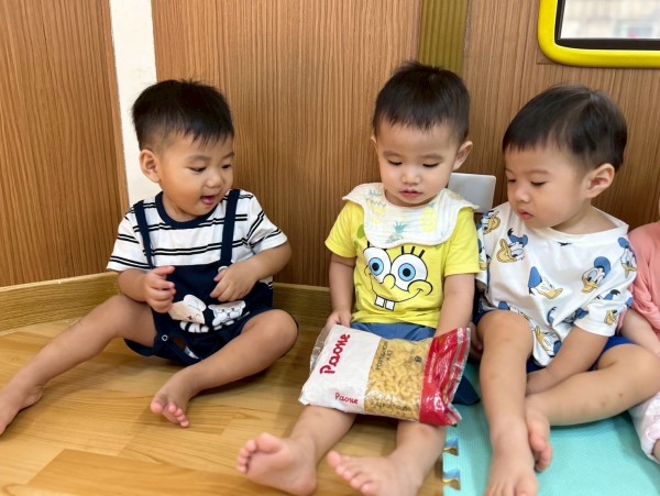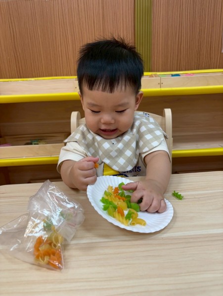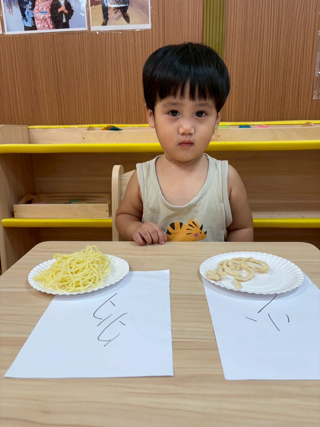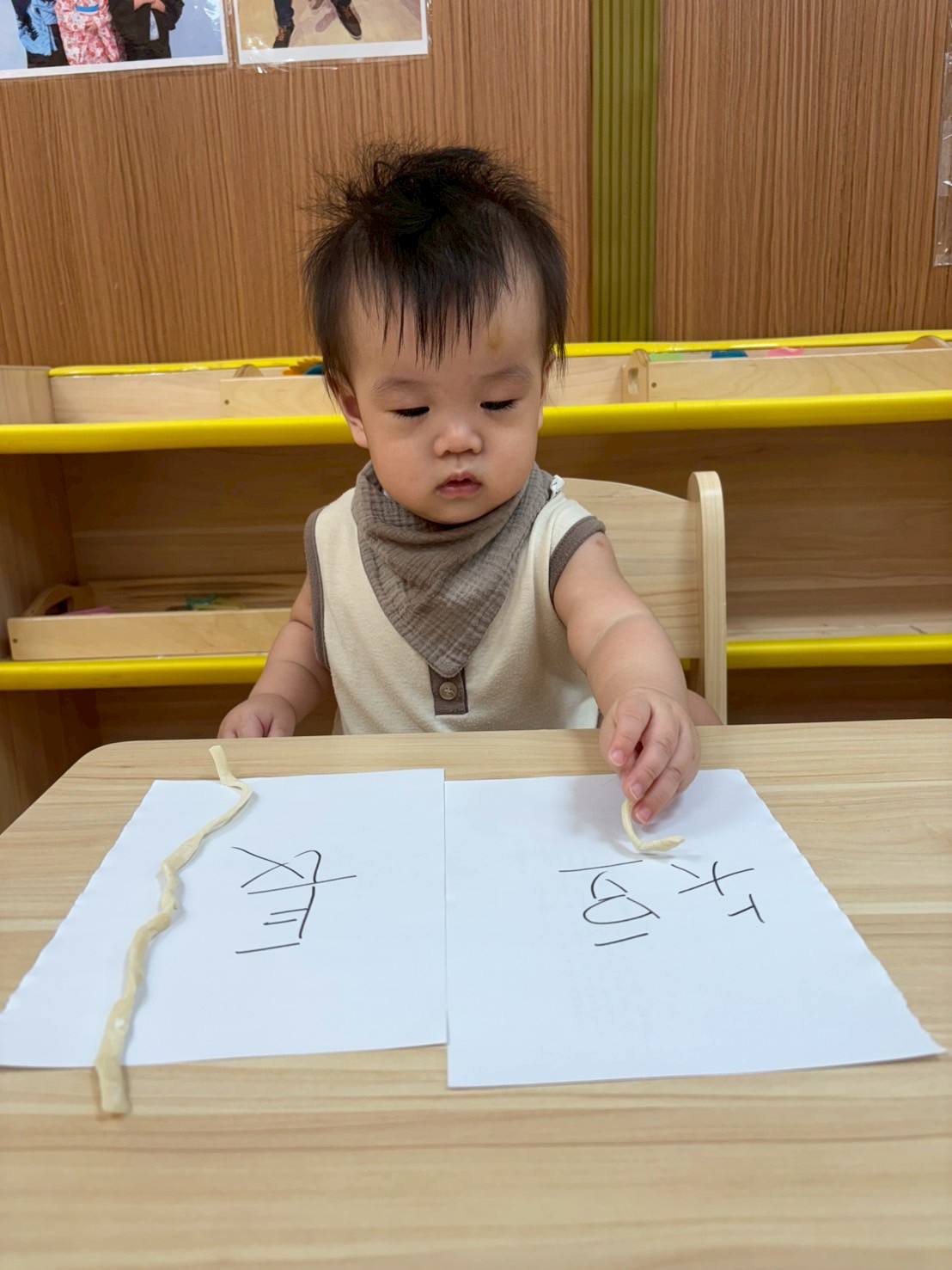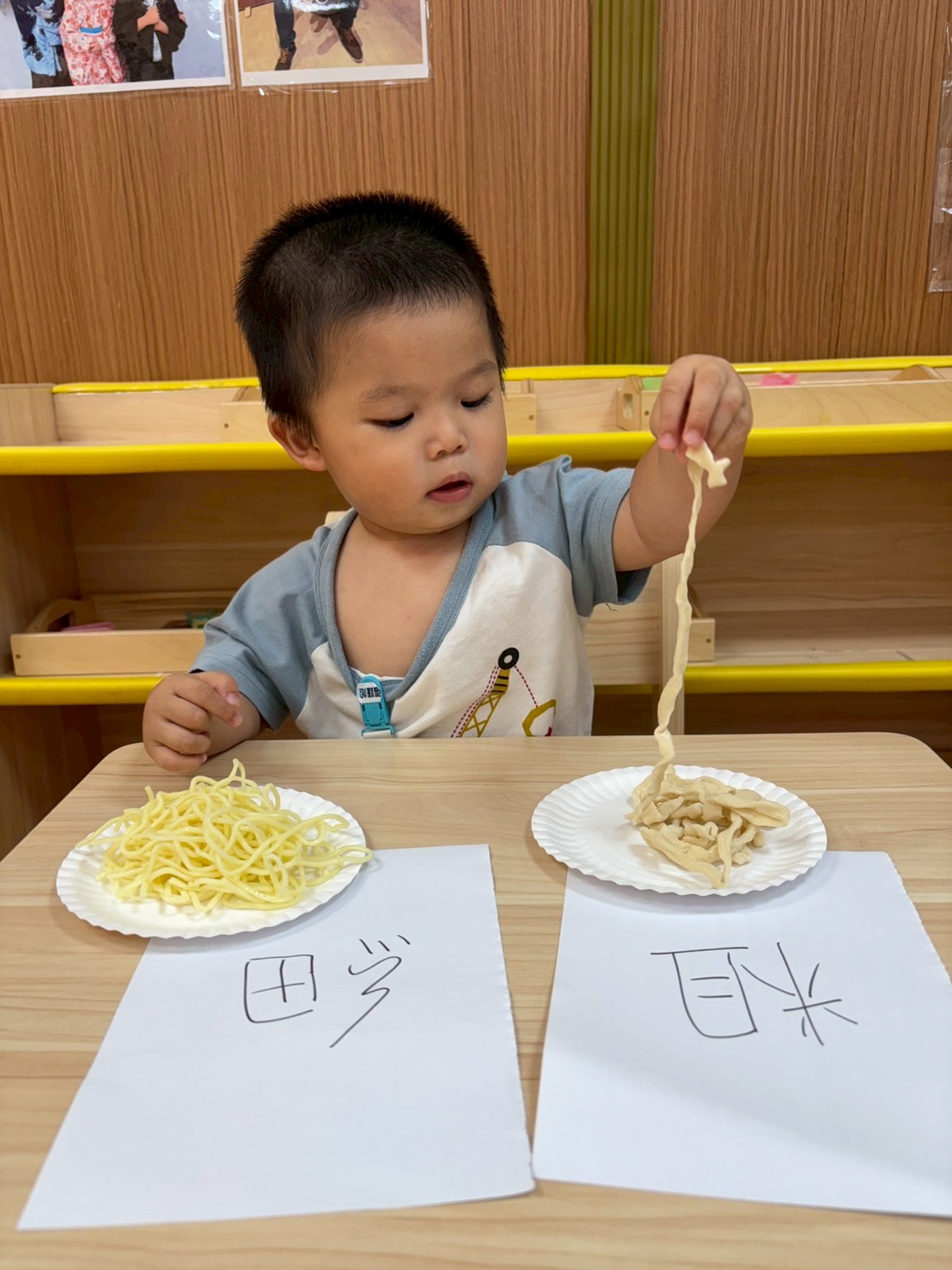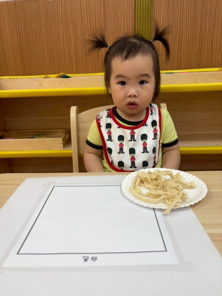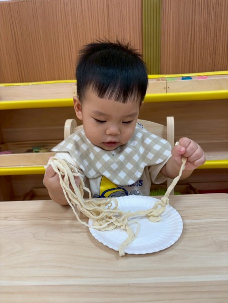 這週課程進行『好吃的麵條』,寶貝們興奮地動手玩著麵條,有的拉一拉、有的搓一搓,比較大的寶貝還會拿著麵條比較長短,在課程中體驗到不同的感官樂趣呢!