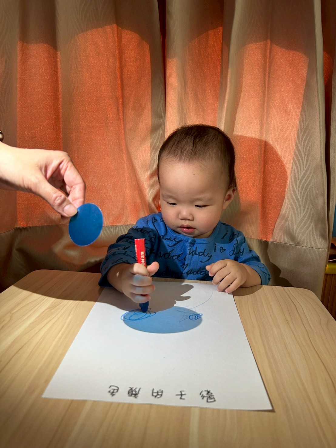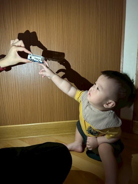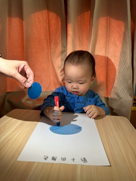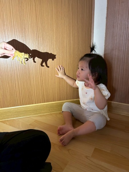 老師準備了交通工具的小圖片、彩色形狀片以及各種動物教具,利用燈光照射,讓寶貝們觀察光線照在不同物品上時,會出現大小、形狀的影子。寶貝們對於這次的主題課都感到很有趣很好玩呢!